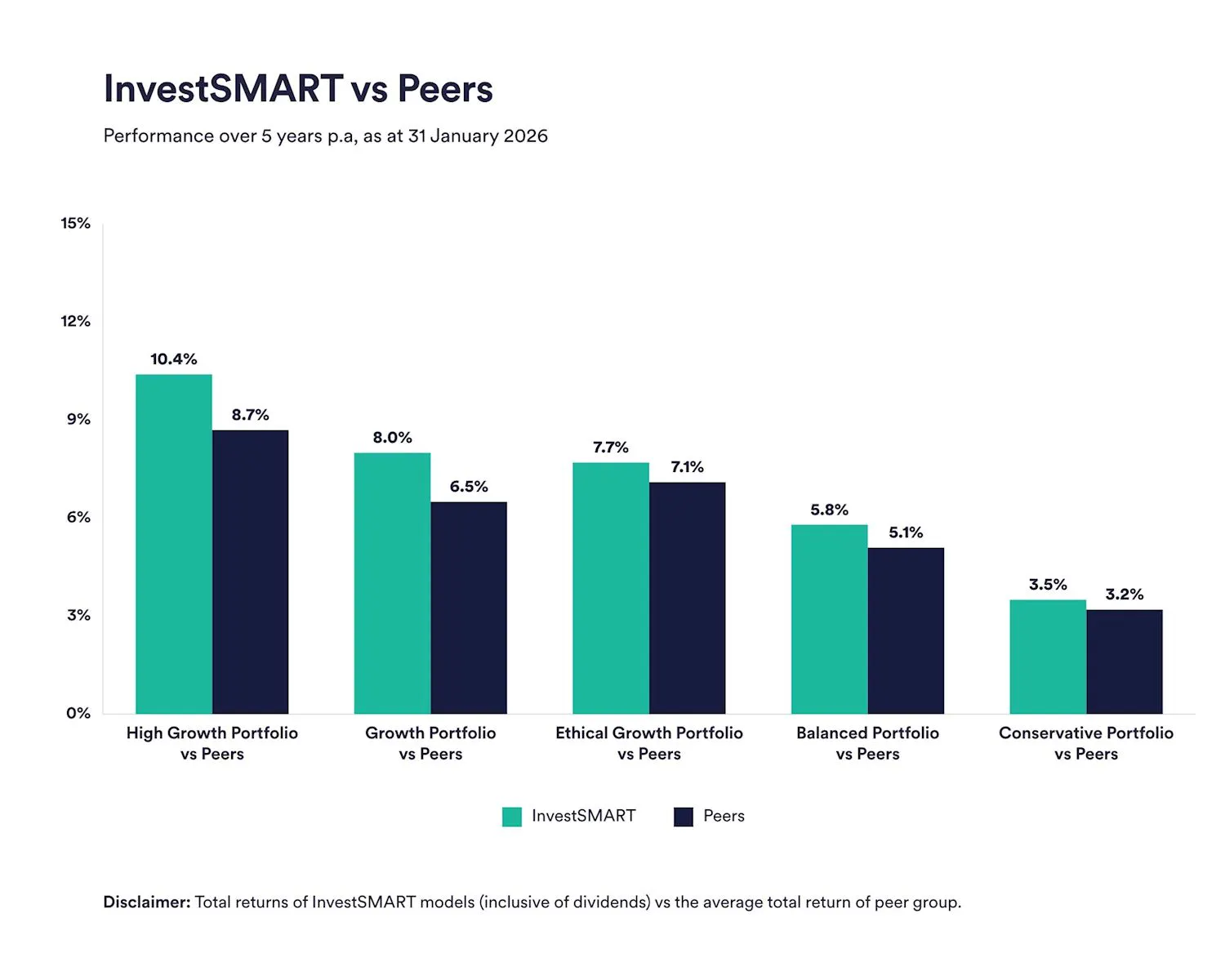 Over five years to 31 January 2026, InvestSMART's diversified portfolios delivered average annual returns between 3.5% and 10.4%, outperforming competitor funds by about 0.3% to 1.7% per year. Over 10 years the diversified portfolios returned between 4.2% and 9.7% per year on average.