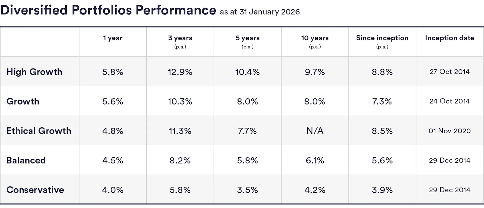 As you can see, over five years, the diversified portfolios have delivered annual returns of between 3.5% and 10.4% on average, outperforming competitor funds by an average annualised return of between 0.3% and 1.7%.