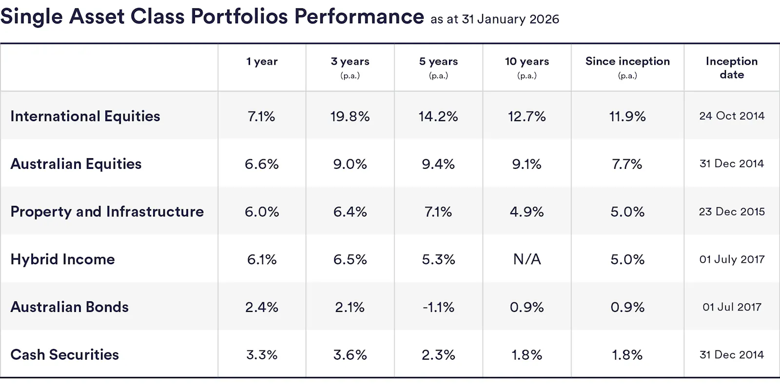 In the 12 months to the end of January 2026, InvestSMART's single-asset portfolios returned between 2.4% (Australian bonds) and 7.1% (International equities). Over five years those single-asset returns ranged from -1.1% p.a. (Australian bonds) to 14.2% p.a. (International equities).